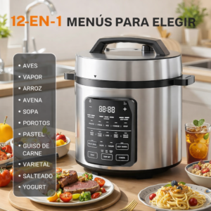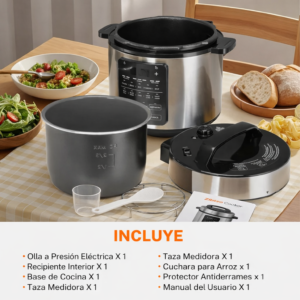 La olla a presión eléctrica ofrece una amplia variedad de funciones para cocinar a tu gusto, incluyendo: cocción lenta, vapor, preparación de yogur, salteado, carnes y guisos, repostería, porridge, multigranos, arroz, sopas, legumbres y aves.