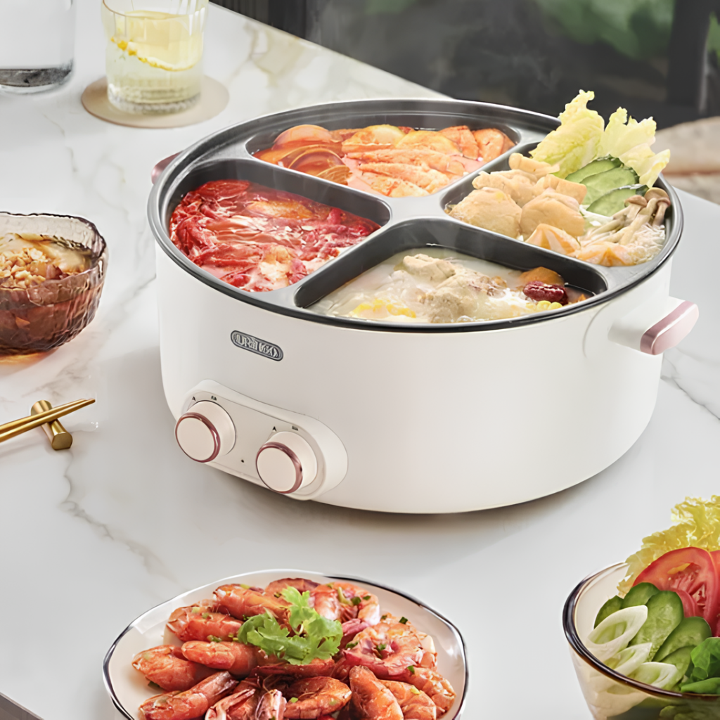 Con controles de temperatura independientes en cada lado del hot pot y un divisor cuádruple de sabores, permite preparar distintos caldos (picante, tomate, coco) o platos al mismo tiempo. Ideal para sopas, guisos, fondues y comidas en grandes cantidades.
